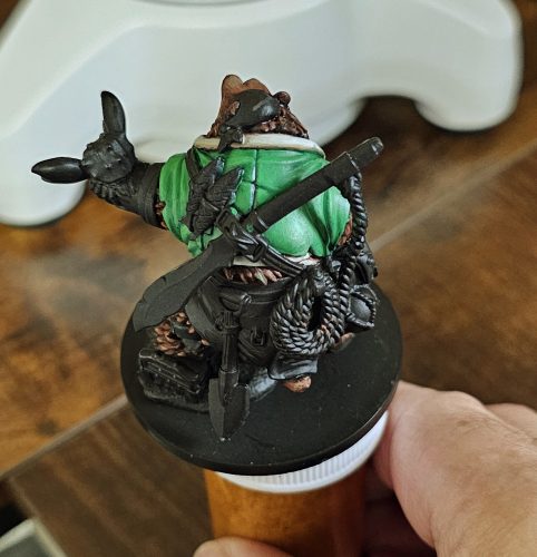 I tried experimenting with the leather boots by using a green color cast to “make things look more interesting”. A concept I saw mentioned a few times online when painting leather. The idea is that black leather, while black, isn’t really “all, or only” black. There’s always some sort of environmental reflections that may add a subtle color cast to the material. The suggestion was to find a color that harmonizes with your models color scheme and go wit that. I used a green that will be similar to the vest I plan on painting next. I’m not 100% sure I pulled it off, but, as they say, “Trust in the Process”, so I am.