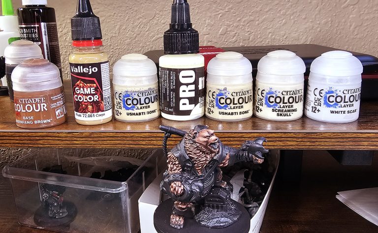 Even before painting the vest, I was second guessing how light and bright the collar for the undershirt was – it seemed too bright and overpowered the brown fur but I figured I’d wait until the vest was done to make the final decision. And, my initial concern was founded. While it is bright and high contrast, it’s too much for the final look I want so I’ll be going back with some warm brown tone washes to breing it back to a more cream color rather than a bright white it ended up being.