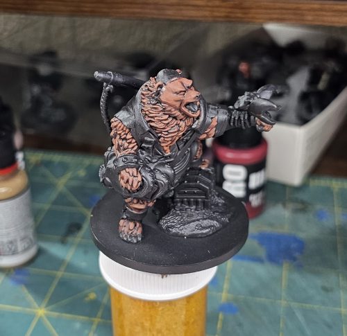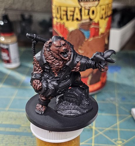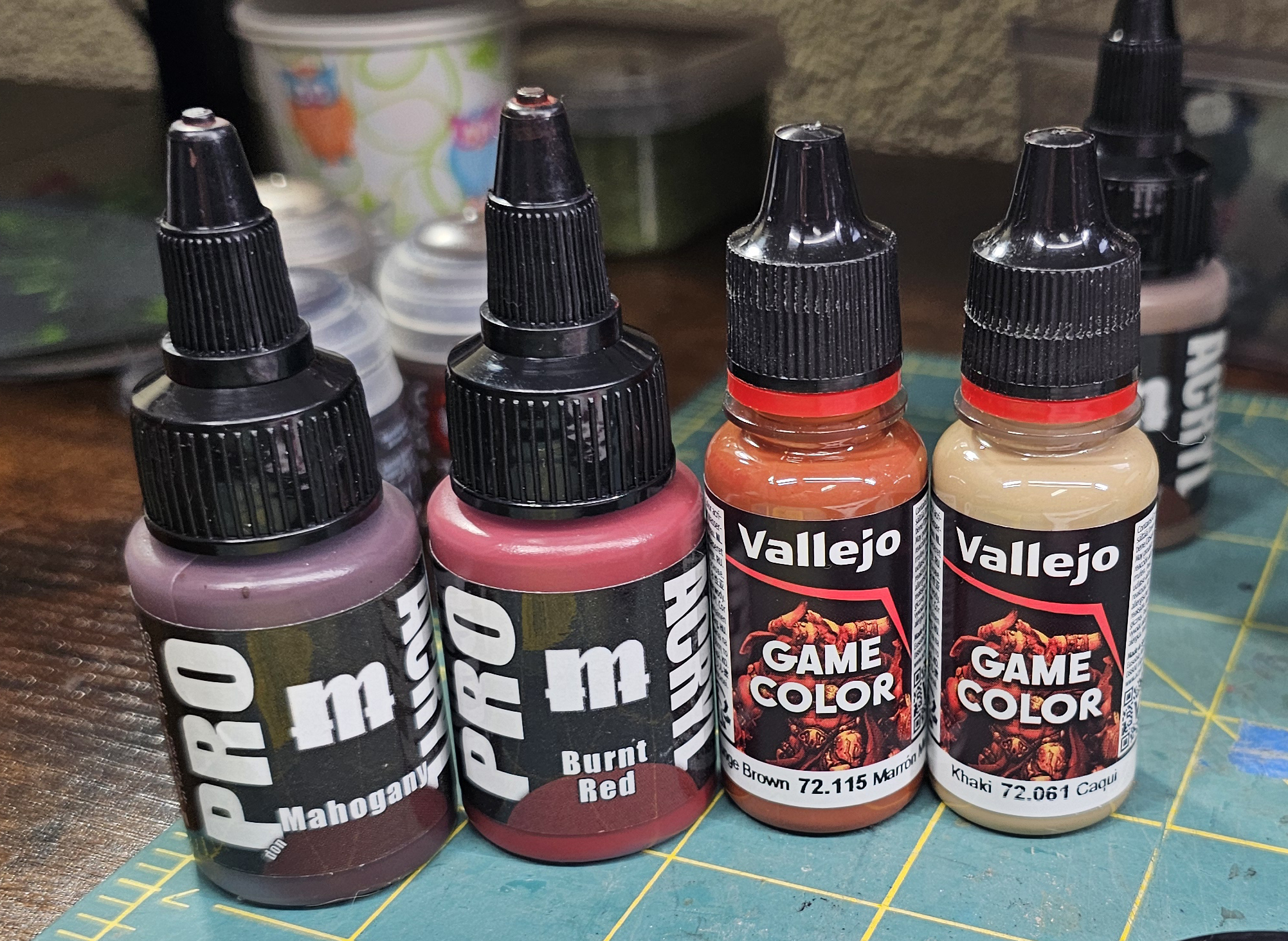 My progression, from the Mahogany washed, previous set of layers, was: Mahogany+Burnt Red –> Grunge Brown in four steps. Once that was done, I gave another Mahogany wash to once again, bring the colors back to a warm tone and to also blend the layers a little. Once the wash was dry I did a straight Grunge Brown, then highlights with a fairly thin Khaki. Steps below.