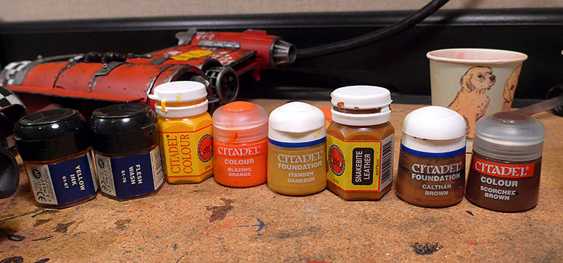 I’m not a big fan of the Bad Moons shade of yellow – to light and bright for me, I prefer a Golden Yellow, something a bit warmer to go with the reds, less contrast. Aaaand, of course, since I haven’t actively painted in some time, my Golden Yellow has dried up hard as a rock So, with what I have on hand that’s salvageable, I try to mix up my own version to limited success.