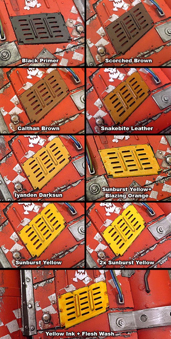 Starting with a black primer, I blanketed the panels with Scorched Brown, then stepped up to Calthan Brown, finishing up my brown base layers with Snakebite Leather.The first real yellow color was the Iyanden Darksun base paint. This went on extremely well and I was really happy at where it was at this point. I figured it would be an easy layering of the other yellows to what I wanted but things didn’t work out that way.